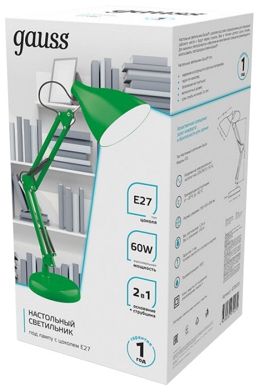 Настольная лампа Gauss GTL003 60W 220-240V E27 зеленый струбцина и основание 1/12 1 720 ₽ Подробнее