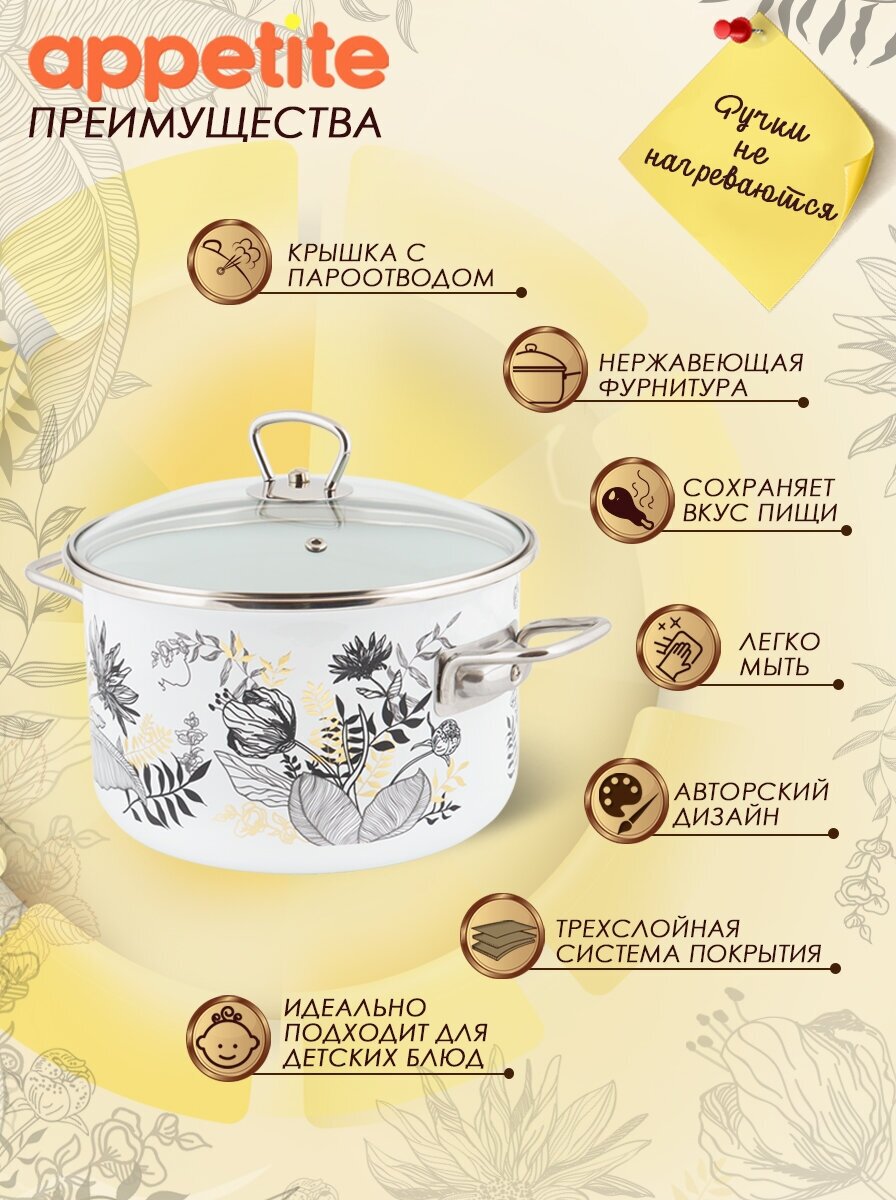 Лучшие цены. Эмалированная кастрюля емкостью 5,5 литров ТМ Appetite серии Botany. Посуда очень экологична, не вступает в реакцию с пищевыми кислотами и щелочами, тем самым сохраняется вкус пищи, в нее не попадают вредные для здоровья человека соединения. В кастрюле можно не только готовить, но и безопасно хранить пищу. Кастрюля также подходит для заготовок и маринования, для шашлыков, для супов, для квашения - это универсальная посуда на кухне. Магазины в вашем городе.