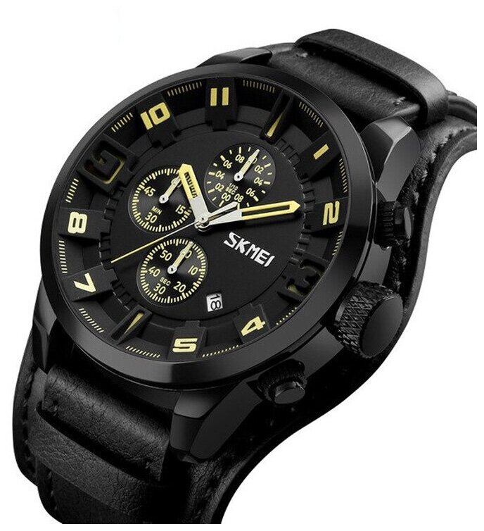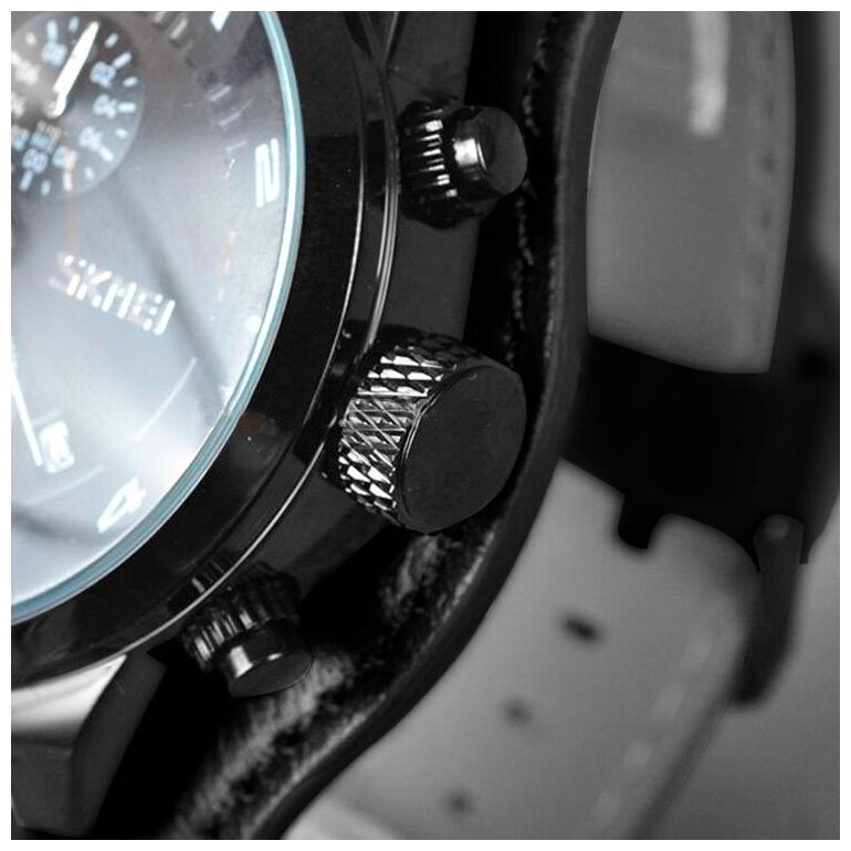 Лучшие цены. Стильные мужские часы SKMEI 9165 с кожаным ремешком – прекрасный аксессуар для настоящих мужчин. Съемный декоративный элемент браслета делает часы брутальными и массивными. Яркий дизайн циферблата добавляет SKMEI 9165 оригинальности, такие часы точно заметят окружающие. Аксессуар прекрасно сочетается с любым стилем одежды, и Вы спокойно сможете надеть их на деловую встречу, на утреннюю пробежку или на семейный выезд на природу. Эти часы везде будут уместны. Магазины в вашем городе.