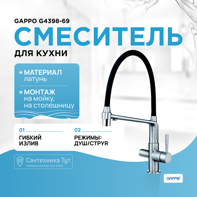 Смеситель для кухни 35к G4398-7 GAPPO гибкий излив, с вых. для питьевого фильтра, черный-хром