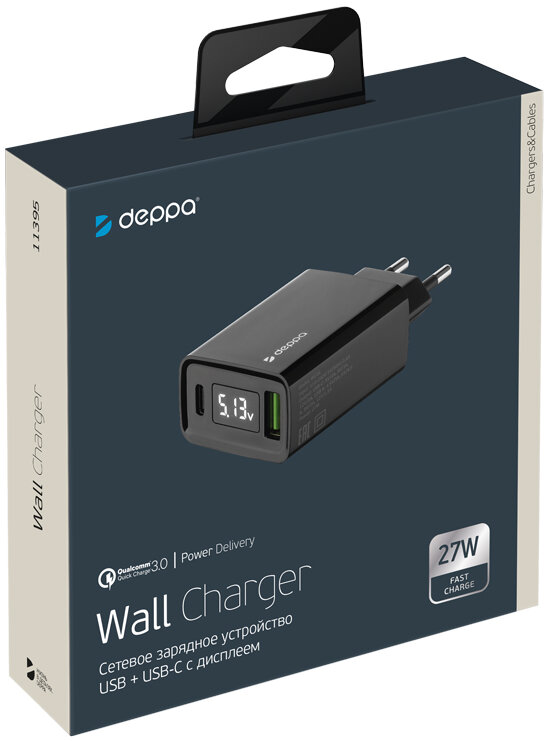 DEPPA Сетевое зарядное устройство Deppa (11395) USB-C+USB A, QC 3.0, PD, дисплей 27Вт, черный