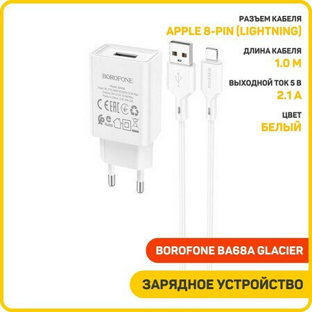 Зарядки для гаджетов Сетевое зарядное устройство (СЗУ) Borofone BA68A Glacier (USB) + кабель Lightning, 2.1 А, белый