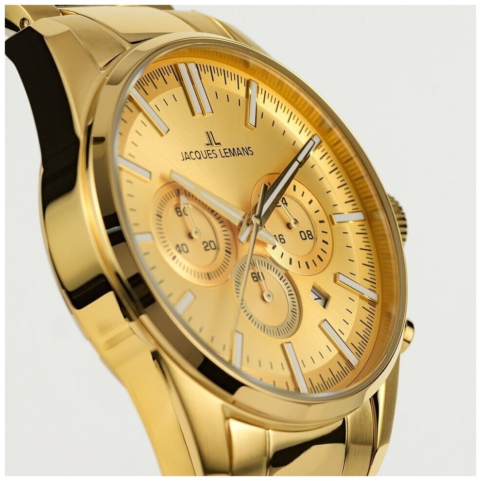 Лучшие цены. Часы наручые Jacques Lemans 1-2119i. Современный спортивный хронограф от Jacques Lemans установлен в массивный корпус из гипоаллергенной нержавеющей стали. Для декора используется эффектное PVD-покрытие из желтого золота. На хорошо читаемом золотистом циферблате с полировкой размещены дополнительные индикаторы хронографа: 24-х часов, счетчики минут и секунд, а также, окошко даты. Магазины в вашем городе.
