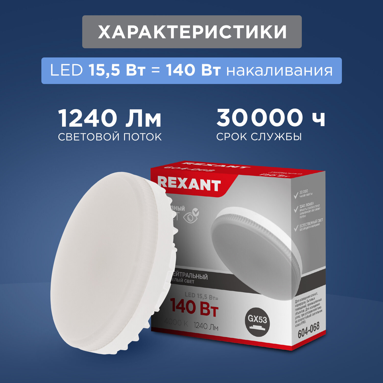 Лампа светодиодная GX53 таблетка 15,5Вт 1240Лм AC180~265В 4000К нейтральный свет REXANT, цена за 1 шт