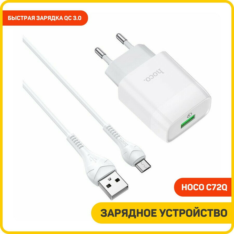 Сетевое ЗУ HOCO C72Q, QC3.0, 1хUSB-А, 3А + кабель (AM-microBM), 1 м, белый (30/180)
