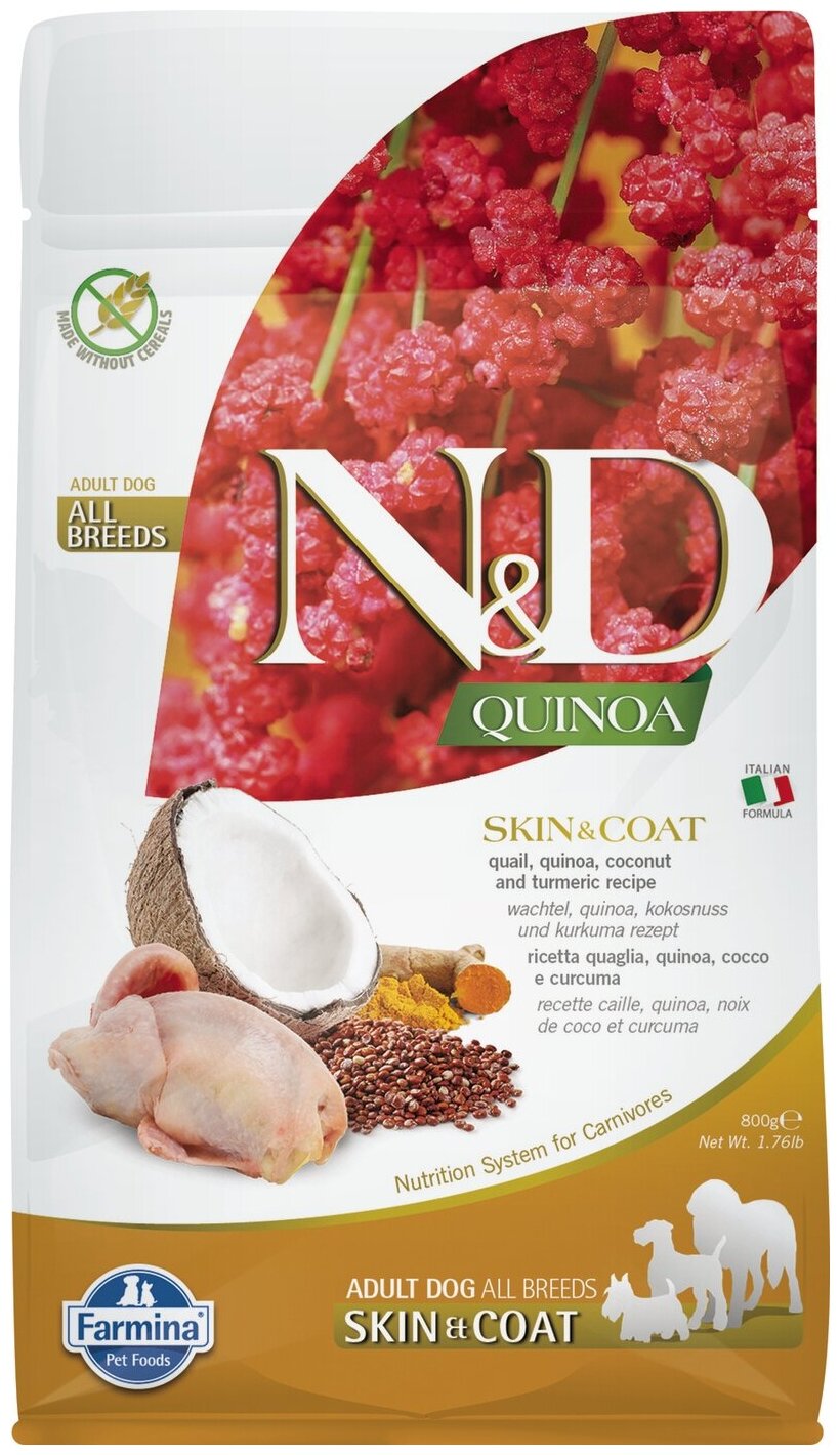 Корм для собак Фармина 35561 N&D QUINOA Skin&Coat корм беззерновой д/собак для здоровья кожи и шерсти Перепел с Киноа 800г