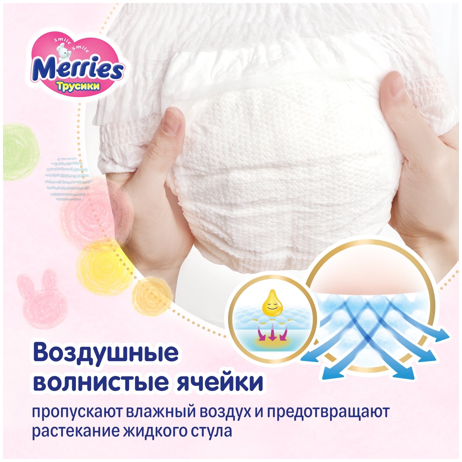 Трусики-подгузники Merries для детей размер S / 2 (4-8 кг), 62 шт, дышащие