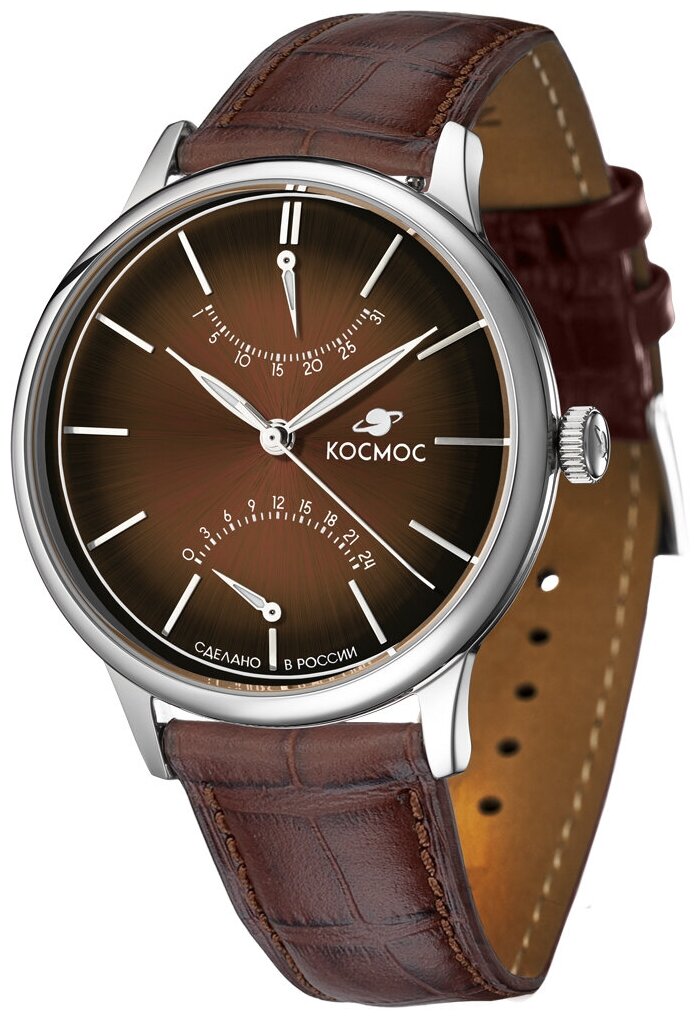 Лучшие цены. Часы Космос с кварцевым механизмом необычны по нескольким причинам. Во-первых, корпус из гипоаллергенной нержавеющей стали в профиль напоминает летательный аппарат. Этот эффект достигается благодаря выгнутым задней крышке и циферблату, а так же сферическому минеральному стеклу. Во-вторых, в окраске циферблата применили градиент: коричневый цвет по краям более насыщенный, чем в центре. Магазины в вашем городе.