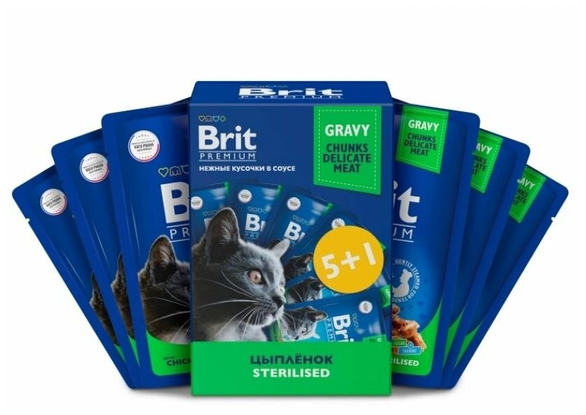 Brit Premium 0,085кг Промо-Набор 5+1 цыпленок в соусе паучи для взрослых стерилизованных кошек