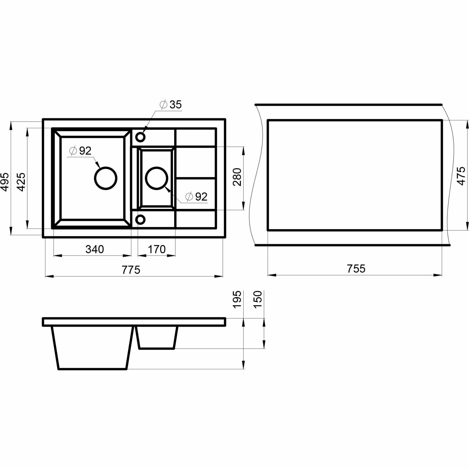7802, эспрессо, мойка кухонная Granula, 1.5чаши+крыло, 775*495*195/150 мм