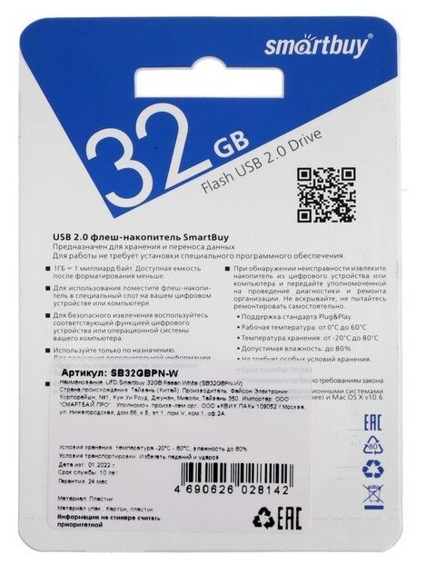 Лучшие цены. Память USB Flash Smartbuy Paean [SB32GBPN-W] представляет собой компактный накопитель данных, заключенный в стильный корпус. Белоснежная расцветка этой модели делает ее универсальным приобретением для любого пользователя независимо от его пола, возраста и рода деятельности. Идеально гладкая глянцевая поверхность корпуса приятна на ощупь. За счет стандартной прямоугольной формы флешка легко устанавливается и извлекается из соответствующего разъема компьютерного устройства. Магазины в вашем городе.