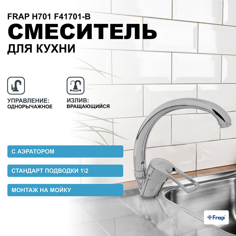 Смеситель для кухни Frap F41701-B, однорычажный, хром 2 000 ₽ Подробнее