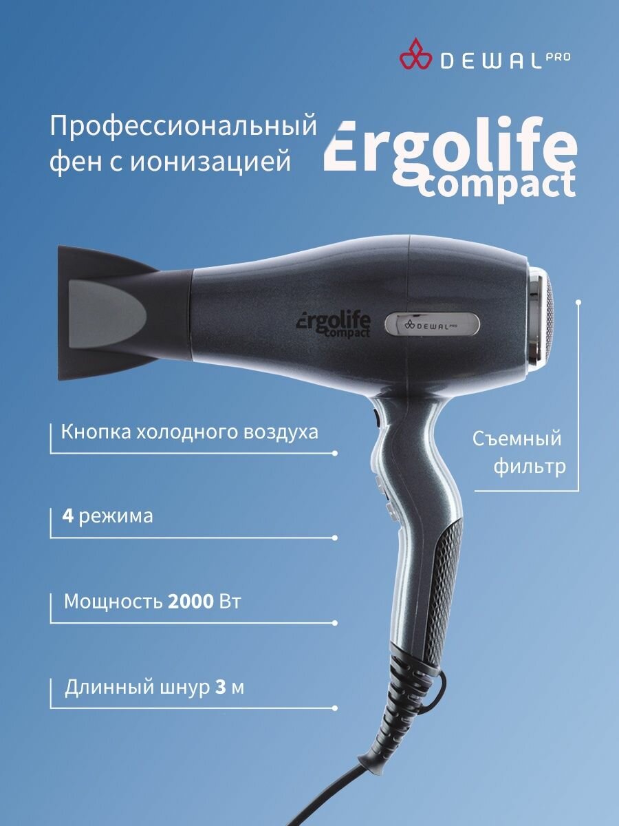 Фен DEWAL ERGOLIFE COMPACT, графит, вес 550гр, 2000Вт, ионизация, 2 нас, провод 3м