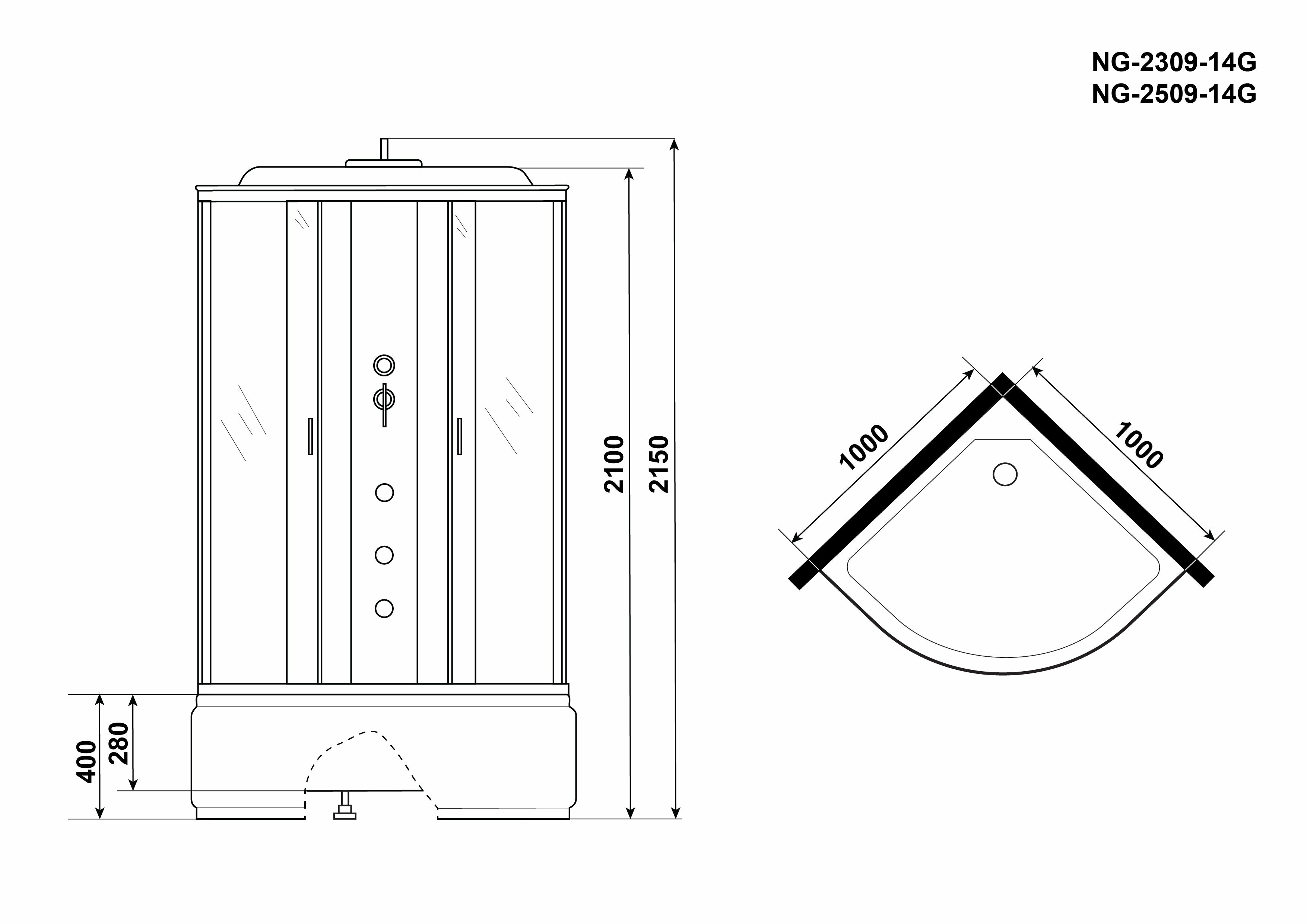 Душевая кабина с гидромассажем NG- 2309-14 (1000х1000х2150) высокий поддон(45см) стекло матовое