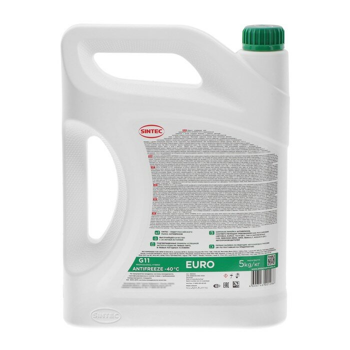 Лучшие цены. Sintec EURO G11 (зелёный) — синтетическая охлаждающая жидкость, разработанная по уникальной технологии на основе качественного моноэтиленгликоля, малозольных присадок и ингибиторов коррозии. Отличный вариант для атмосферных и турбированных бензиновых/дизельных двигателей — новых и с пробегом, функционирующих в режиме интенсивных нагрузок. {REGION. prepositional|before: ' в '; after: '} антифриз покупают для коммерческих и легковых автомобилей, автобусов, другой техники. Магазины в вашем городе.