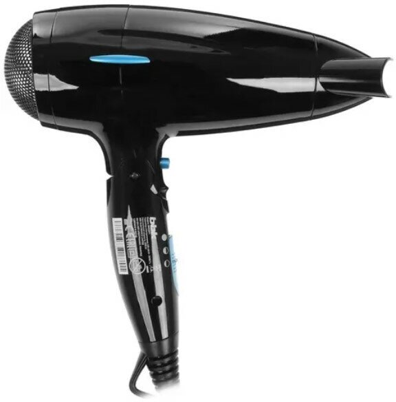 Фен для волос BBK BHD3201i черный/голубой, мощность 2000 Вт, 2 температурных режима, 2 скорости обдува, складная ручка, ионизация