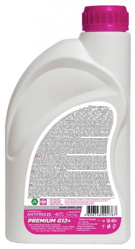 Sintec Antifreeze Premium G12+ Антифриз Готовый Розовый (1кг / 0,92л) SINTEC арт. 990453
