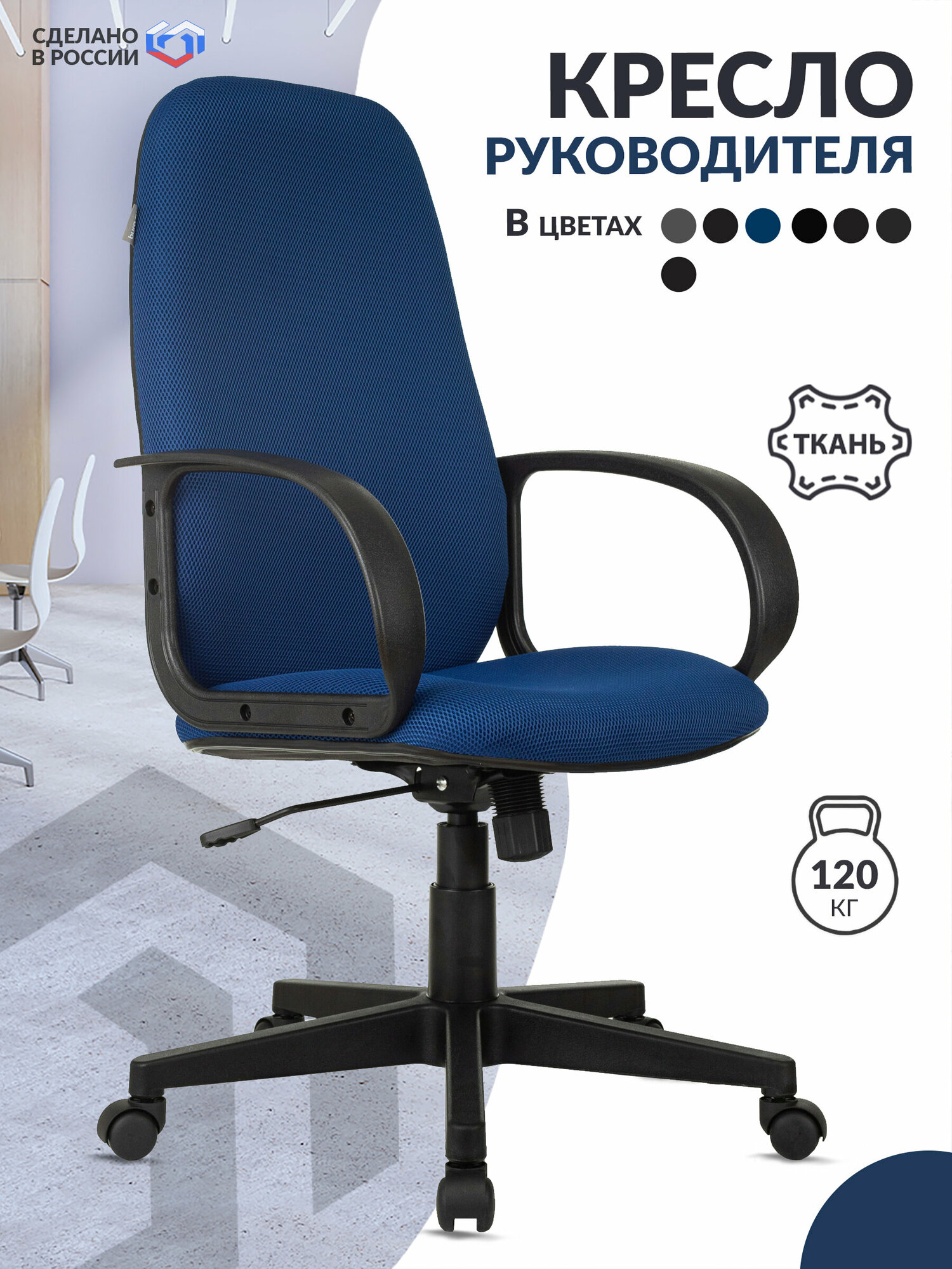 Кресло Бюрократ компьютерное синее, ткань, крестовина пластик - Кресло руководителя, с подлокотниками