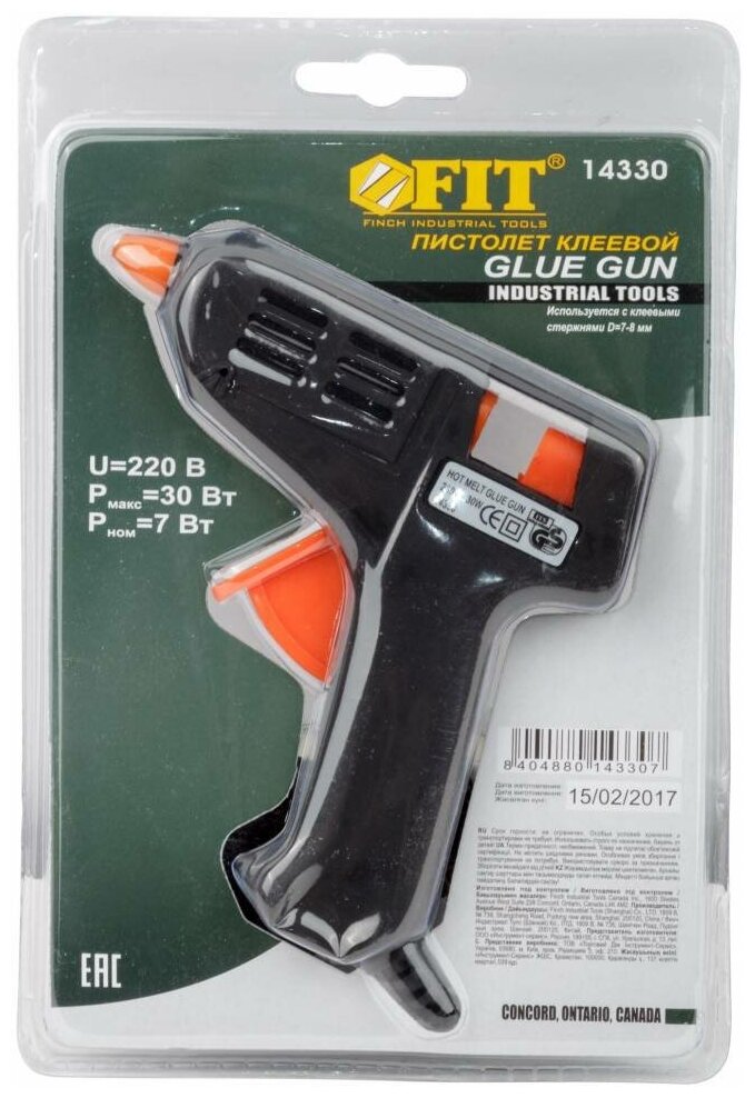 Лучшие цены. Клеевой пистолет FIT 14330 Равномерно распределяет по поверхностям расплавленный клей температурой 150-200 градусов; Мощность: 10Вт (30Вт); Для работы необходимы клеевые стержни длиной до 10 см и диаметром 7-8 мм; Функционирует от электросети. Благодаря длинному сетевому шнуру(1,5м) можно работать на достаточно большом расстоянии от розеток. Также стоит отметить удобный для хвата корпус и малый вес; Когда пистолет FIT 14330 включен в розетку, но не используется одну-две минуты, его можно положить на скобу. Магазины в вашем городе.