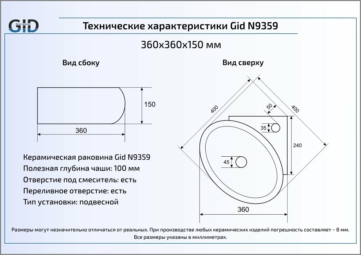 Подвесная раковина 36x36х15 см, Gid, N9359