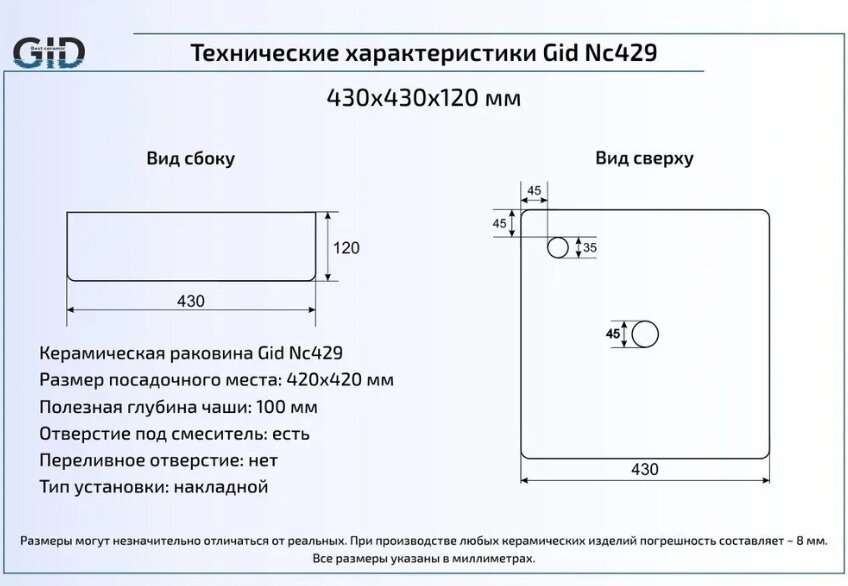 Раковина накладная (43х43) Gid Nc429 6 608 ₽ Подробнее