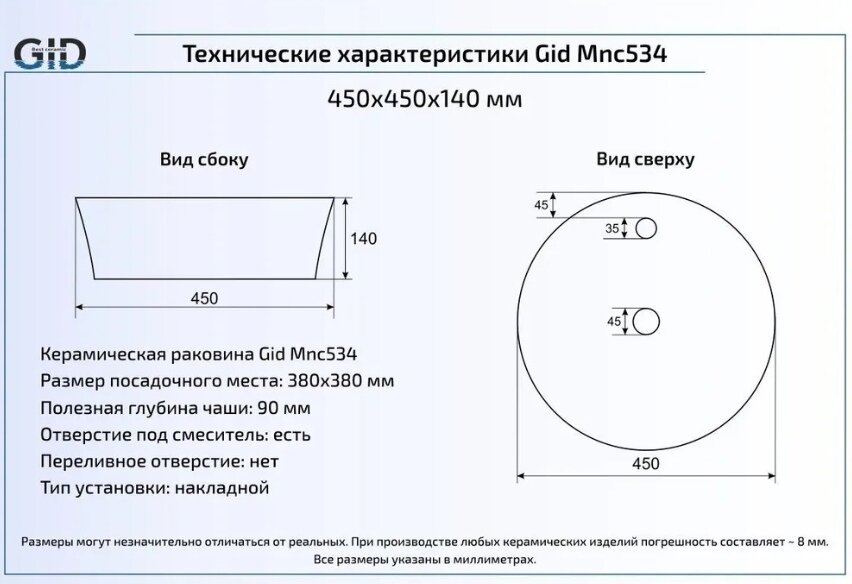 Накладная раковина для ванной Gid Mnc534 с донным клапаном 10 900 ₽ Подробнее