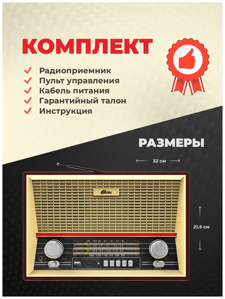 Лучшие цены. Радиоприемник Ritmix RPR-102 Wood, стерео, ретро-дизайн, usb, SD, аудио вход AUX, УКВ-FM, AM, 2SW, ДУ, питание 9-220в RPR 102 Brown Полноразмерный радиоприёмник в ретро-стиле. Четыре диапазона радиовещания, включая FM. Поддержка режима аудиоплеера. Выверенный временем ретро-стиль, подчеркивающий Ваш хороший вкус, в сочетании с современными технологиями. Деревянный полноразмерный корпус, высококачественные динамики и стандартный выход на наушники, телескопическая поворотная радиоантенна, понятная и удобная. Магазины в вашем городе.