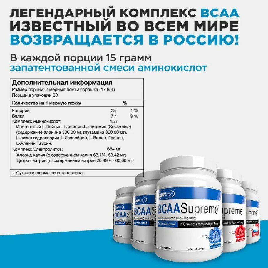 | Дополнительные ингридиенты | бета-аланин / цитруллин / AAKG / витамины / минералы / лизин, гистидин, треонин, метионин, фенилаланин |
