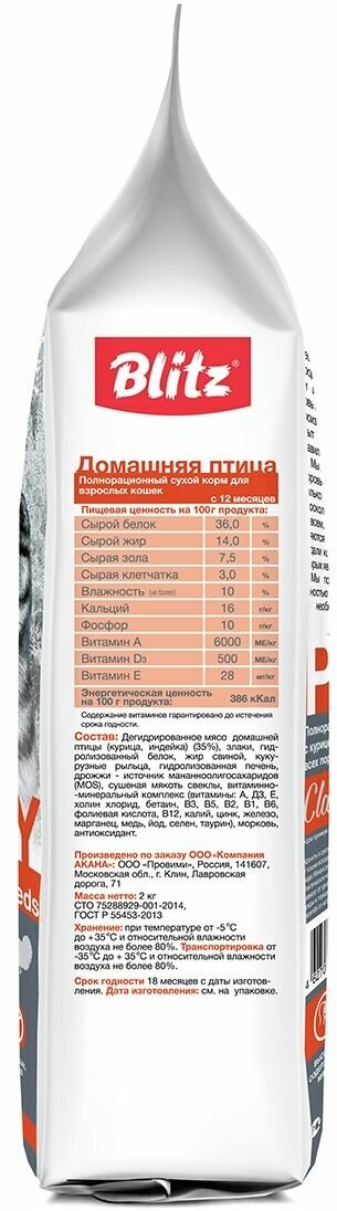 Лучшие цены. Blitz Adult Cat Poultry Линия кормов Blitz Classic для кошек Создавая полнорационный корм для взрослых кошек, мы ориентировались на классический рецепт вкусного питания, который бы не только нравился питомцам, но и удовлетворял их потребности. Blitz Adult Cat Poultry изготовлен из мяса домашних птиц кур и индеек. Мы не использовали костное сырьё, только мягкие ткани птиц, так как считаем, что корм премиального класса должен содержать качественные и полноценные источники белка. Магазины в вашем городе.