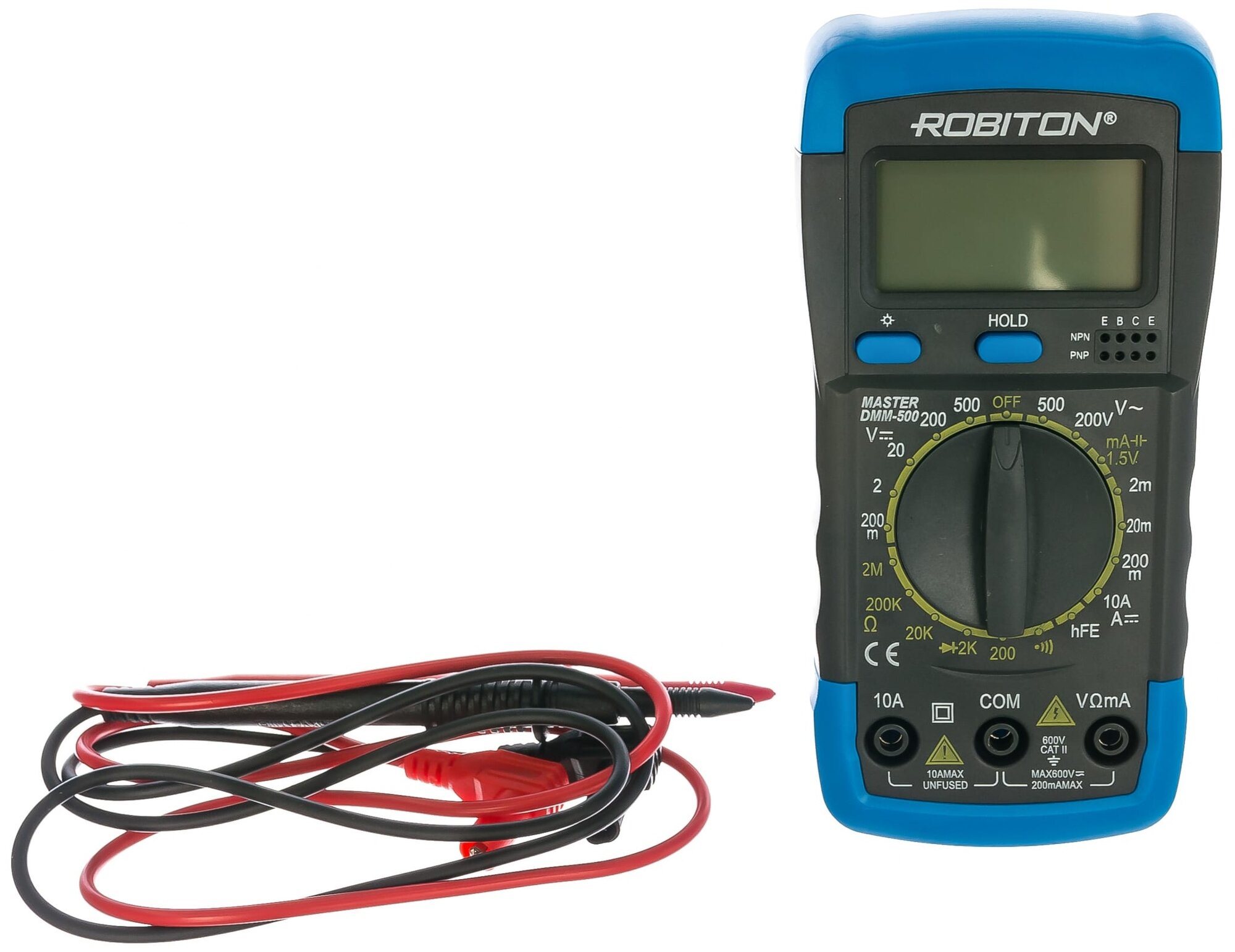 Лучшие цены. ROBITON MASTER DMM-500 - цифровой мультиметр, который измеряет постоянное и переменное напряжение, постоянный ток, сопротивление, hFE транзисторов, напряжение элементов питания до 1,5В, тестирует диоды и проверяет целостность цепи со звуковой индикацией. Среди дополнительных возможностей – подсветка дисплея и память данных. Питание (в комплекте). Магазины в вашем городе.