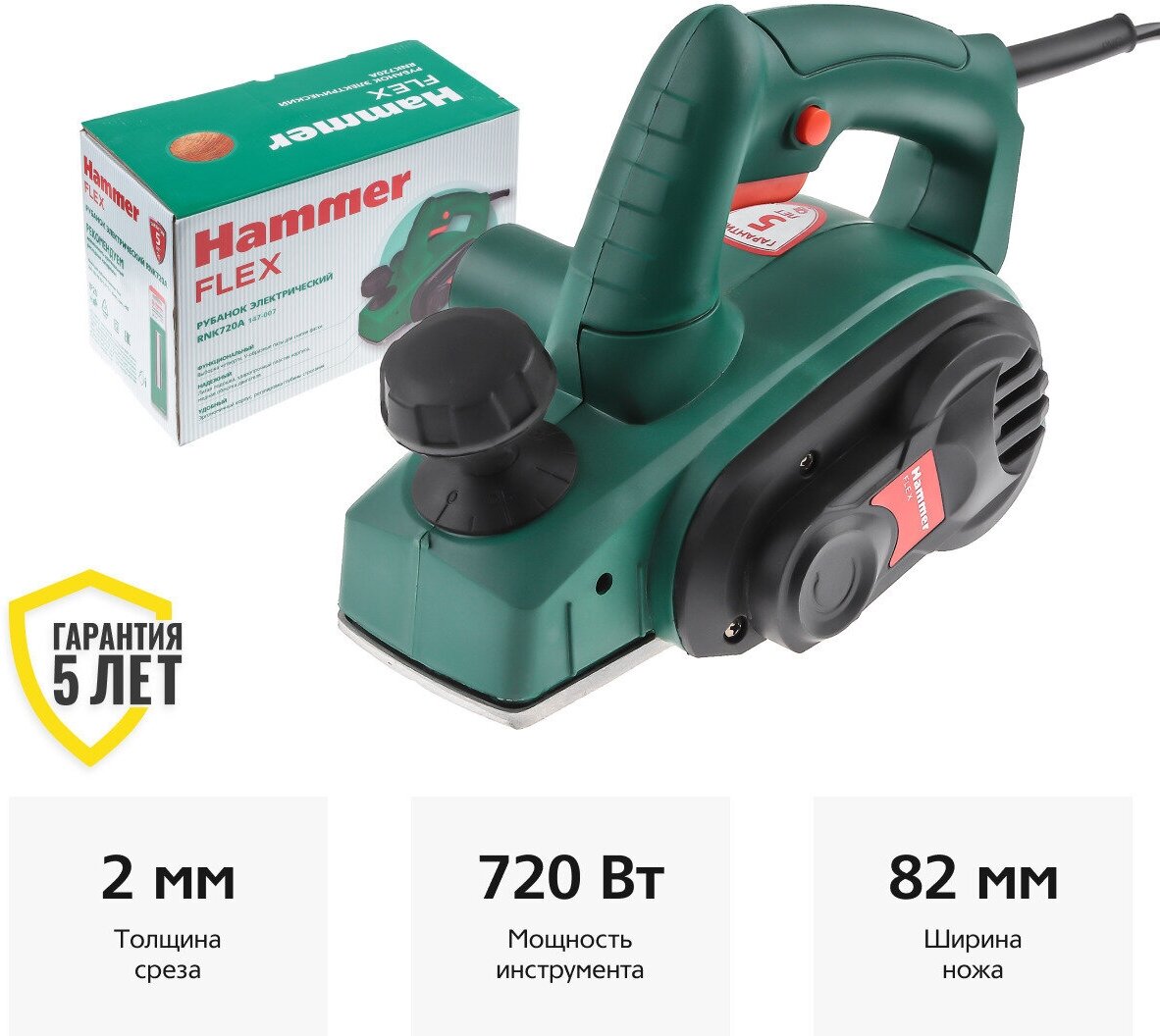 Рубанок электрический HAMMER RNK720A, 720 Вт, 16000 об/мин, глубина - 2 мм, ширина - 82 мм