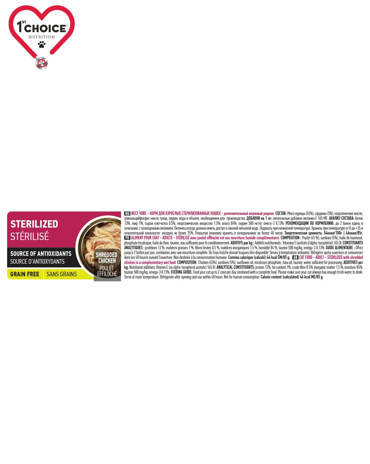 1ST CHOICE STERILIZED консервы для взрослых стерилизованных И кастрированных котов И кошек (курица С сардиной), 85 ГР, 12 штук
