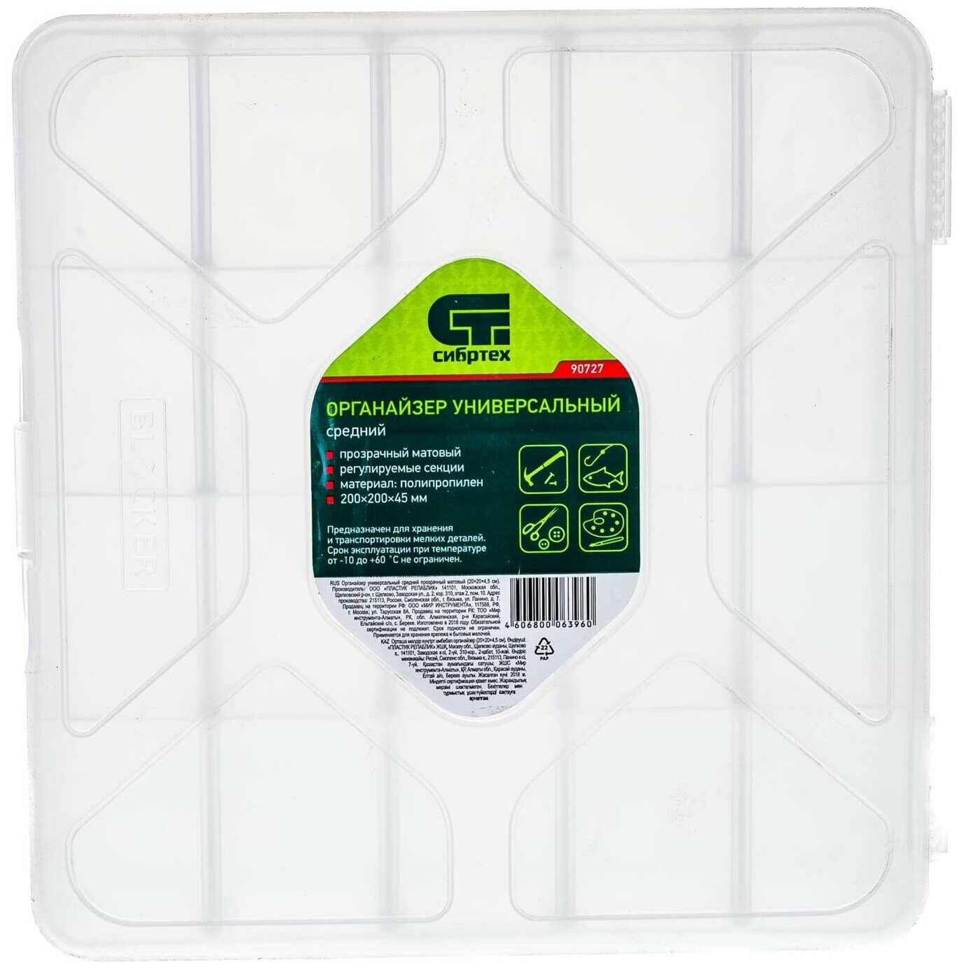 Лучшие цены. Универсальный средний органайзер Сибртех 90727 размером 200 х 200 х 45 мм, прозрачный матовый, используется для практичного хранения мелких предметов. Он подходит для распределения снастей, крепежа, хозяйственных мелочей и других предметов. Органайзер позволяет компактно расположить вещи в скрытых уголках квартиры: в шкафу, под кроватью и т.д. Преимущества Полипропиленовый корпус — вещи защищены от влаги и пыли. Полупрозрачное исполнение — не нужно открывать крышку, чтобы увидеть содержимое органайзера. Магазины в вашем городе.