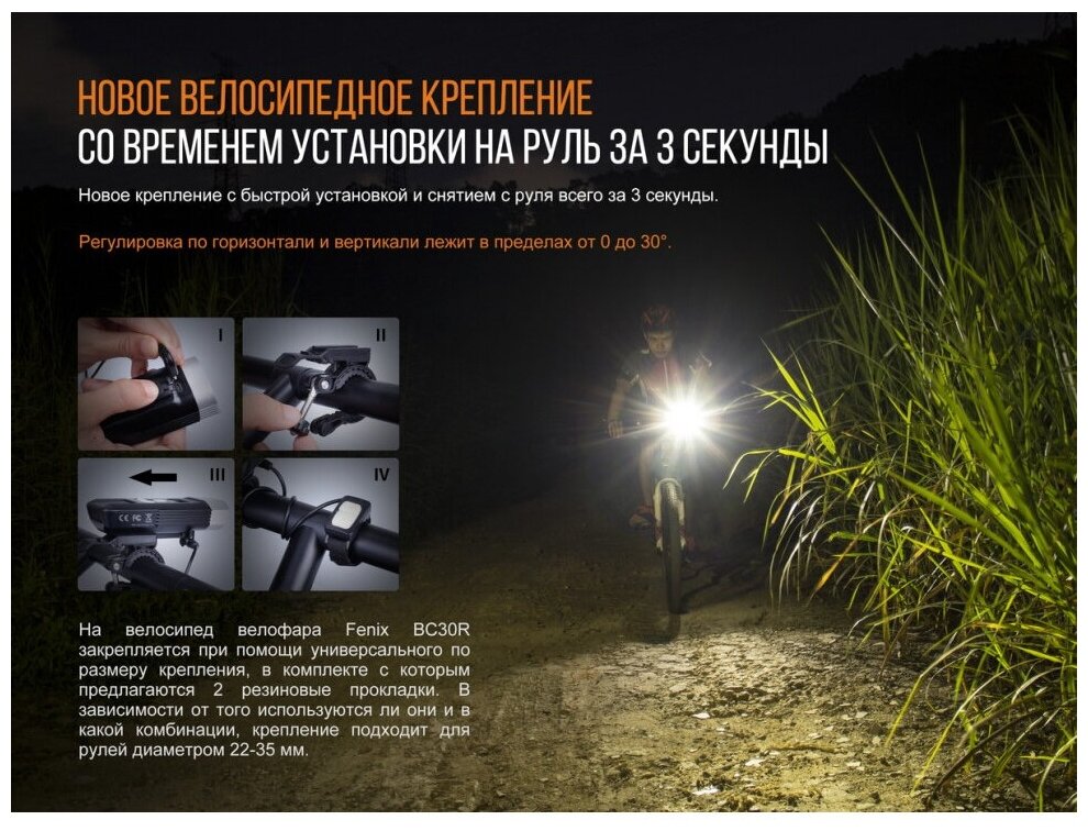 Лучшие цены. Модель Fenix BC30R является велофарой, которую будет удобно использовать даже профессиональным спортсменам. Она может быть закрепленной практически на любом руле, ведь подходящий диапазон его диаметра — 22-35 мм. Для этого в комплекте имеется крепление с двумя дополнительными вставками, которые можно использовать вместе или по отдельности, либо не использовать совсем. Магазины в вашем городе.