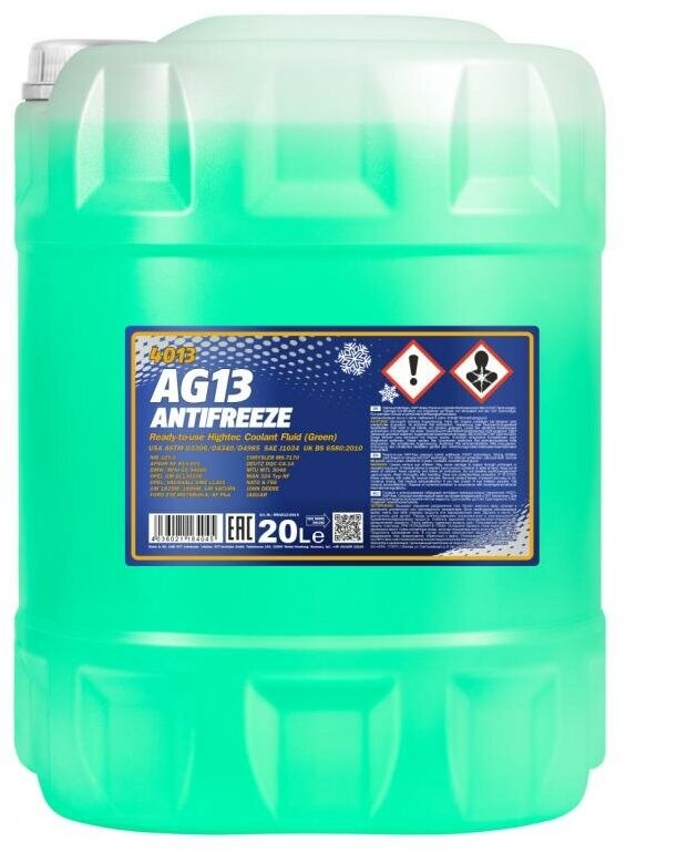 Лучшие цены. Готовый раствор охлаждающей жидкости MANNOL ANTIFREEZE HIGHTER AG13 зеленый, 20 л 2059 предназначен для круглогодичного применения в системах охлаждения, для которых рекомендуется автопроизводителем применять антифризы на моноэтиленгликолевой основе. Благодаря высокотехнологичному пакету присадок обеспечивает эффективную защиту системы охлаждения от всех типов коррозии. Не содержит фосфатов, нитритов, аминов. Магазины в вашем городе.