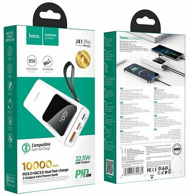 Лучшие цены. Портативный аккумулятор hoco J41/ Powerbank / батарея, зарядка/Повербанк/внешний/ белый/ Подарок мужу, жене, дочке, сыну Внешний аккумулятор Hoco J41, 10000 мАч, microUSB/Type-C - 2 А, iP - 1.5 А, 2 USB - 2 А. Портативный аккумулятор Hoco J41 10000 mAh - это стильная новинка для всевозможных мобильных устройств. В его супер компактном корпусе установлена литий-полимерная батарея с оптимальной емкостью для повседневного использования - 10000 мАч. Магазины в вашем городе.