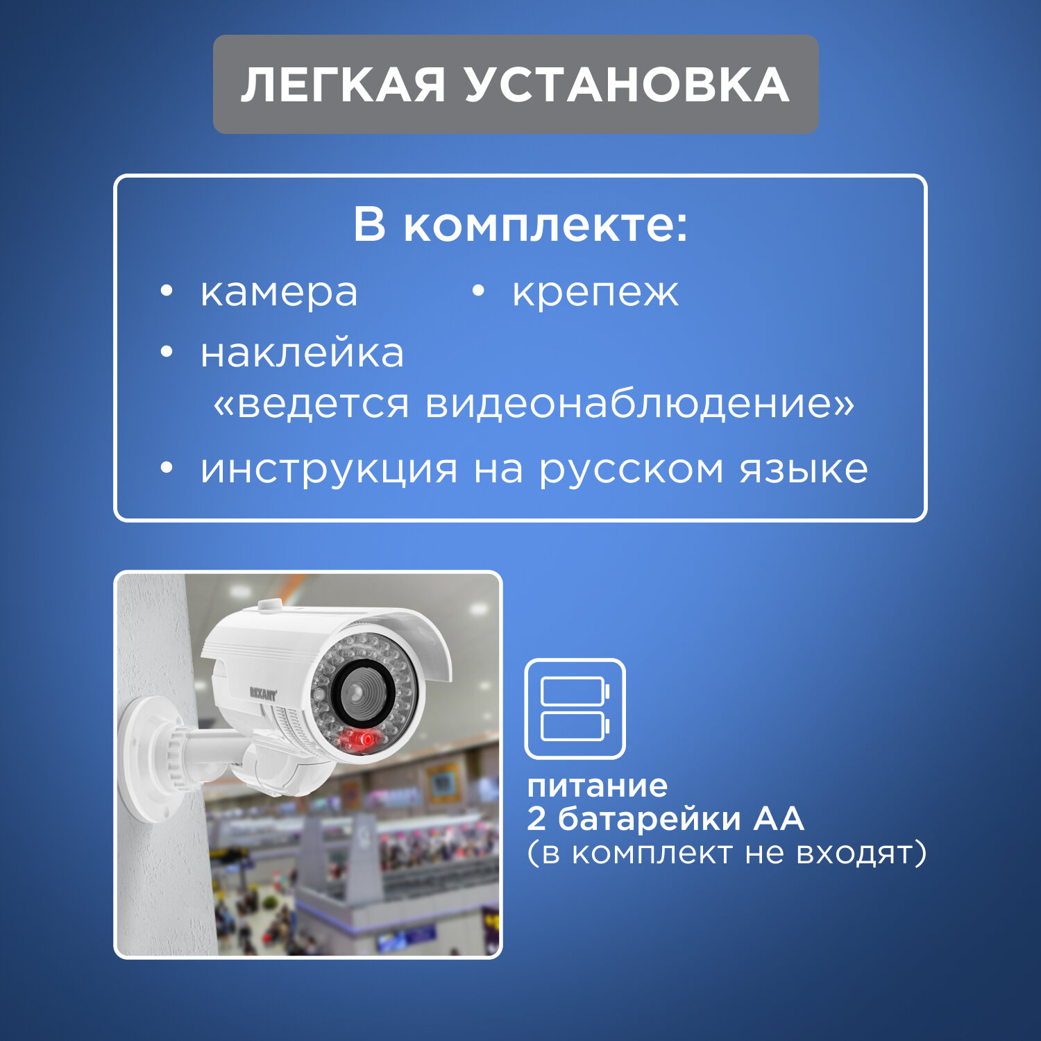 Муляж камеры видеонаблюдения Rexant 45-0240 Неотличим от обычной камеры Мигающий красный светодиод (каждые 5 секунд) Питание: батарейки AА - 2шт. Мате