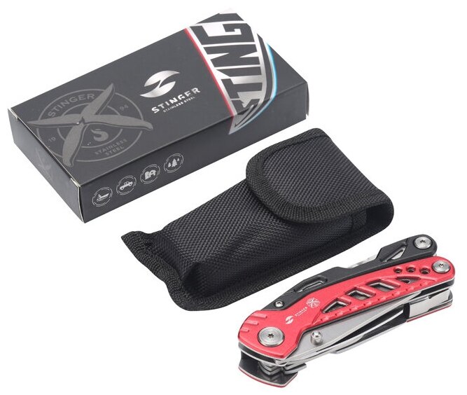 Ножи и мультитулы Мультитул Stinger, 107x37 мм, 11 функций, сталь/алюминий, красно-чёрный, в нейлоновом чехле