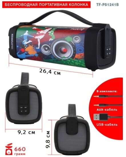 Портативная колонка Telefunken TF-PS1241B, 12Вт, черный [tf-ps1241b(rock music)]