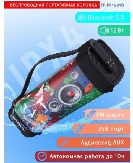Портативная колонка Telefunken TF-PS1241B, 12Вт, 1500мАч, FM, BT, microSD, IPХ4,AUX, принт 2