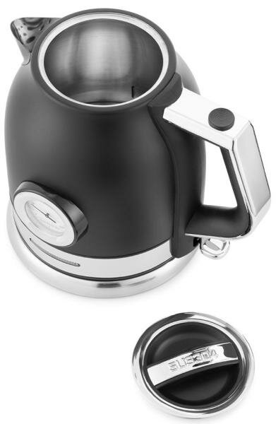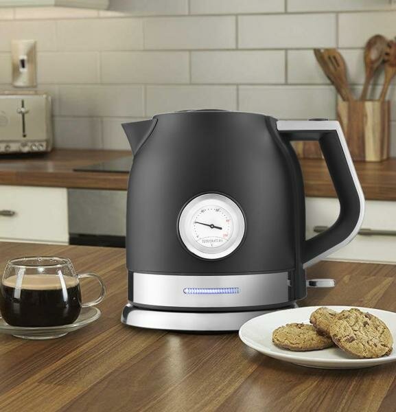 Лучшие цены. Тип: Чайник электрический; Материал корпуса: нержавеющая сталь; Мощность: 2200 Вт; Объём: 1.7 л; Тип нагревательного элемента: закрытая спираль; Безопасность: автоотключение при закипании воды, защита от перегрева; Цвет: чёрный; Прочие особенности и свойства: На корпусе чайника расположен термометр, который показывает температуру воды. Это удобно, если вы готовите напитки, для которых требуются определенная температура воды, например, зеленый чай, чёрный чай, кофе и т. Магазины в вашем городе.