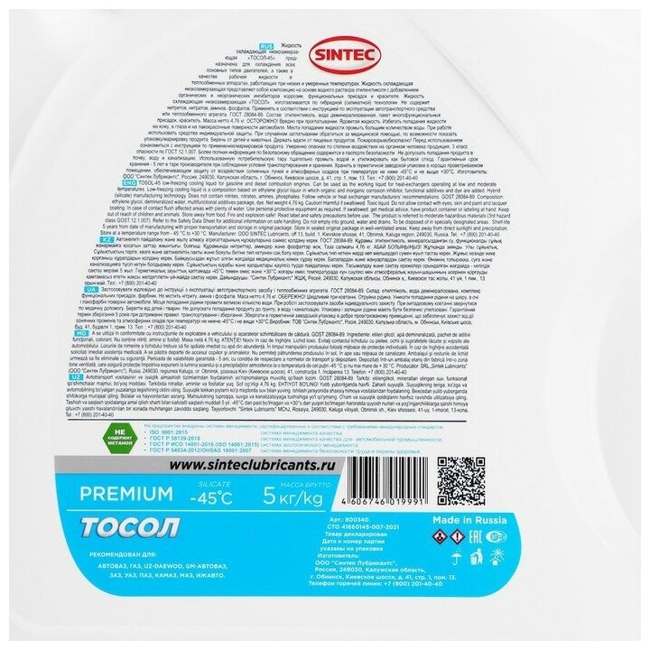 Лучшие цены. SINTEC тосол ОЖ-45 - универсальная высококачественная охлаждающая жидкость. Изготавливается из водного раствора моноэтиленгликоля и многофункционального пакета моющих, антикоррозионных и смазывающих присадок. Предотвращает появление накипи и коррозии в системе охлаждения и обеспечивает нормальный тепловой режим работы двигателя. Можно использовать в качестве теплоносителя в местных системах отопления. Не содержит нитритов и аминов, имеет повышенный срок эксплуатации. Магазины в вашем городе.