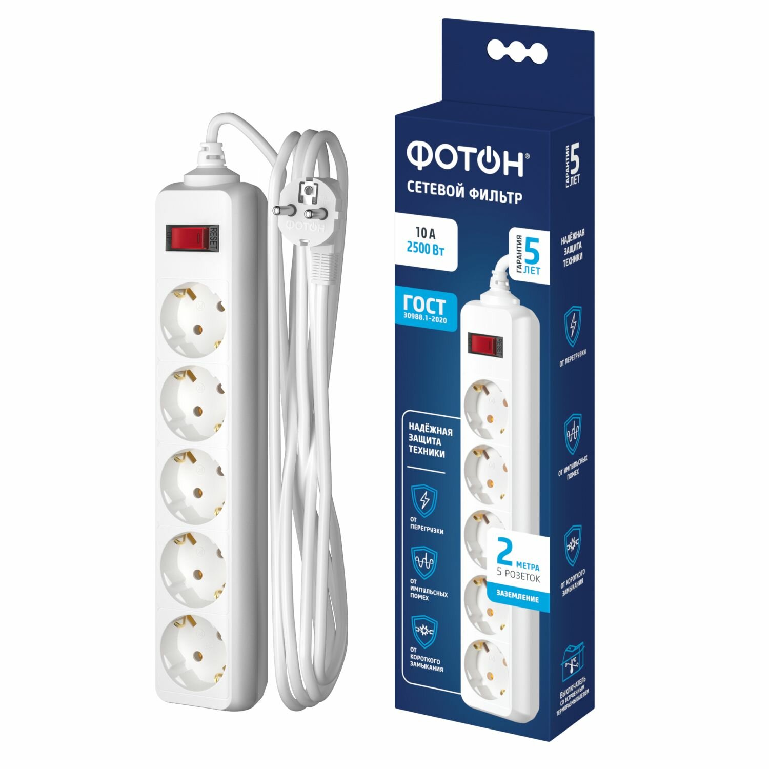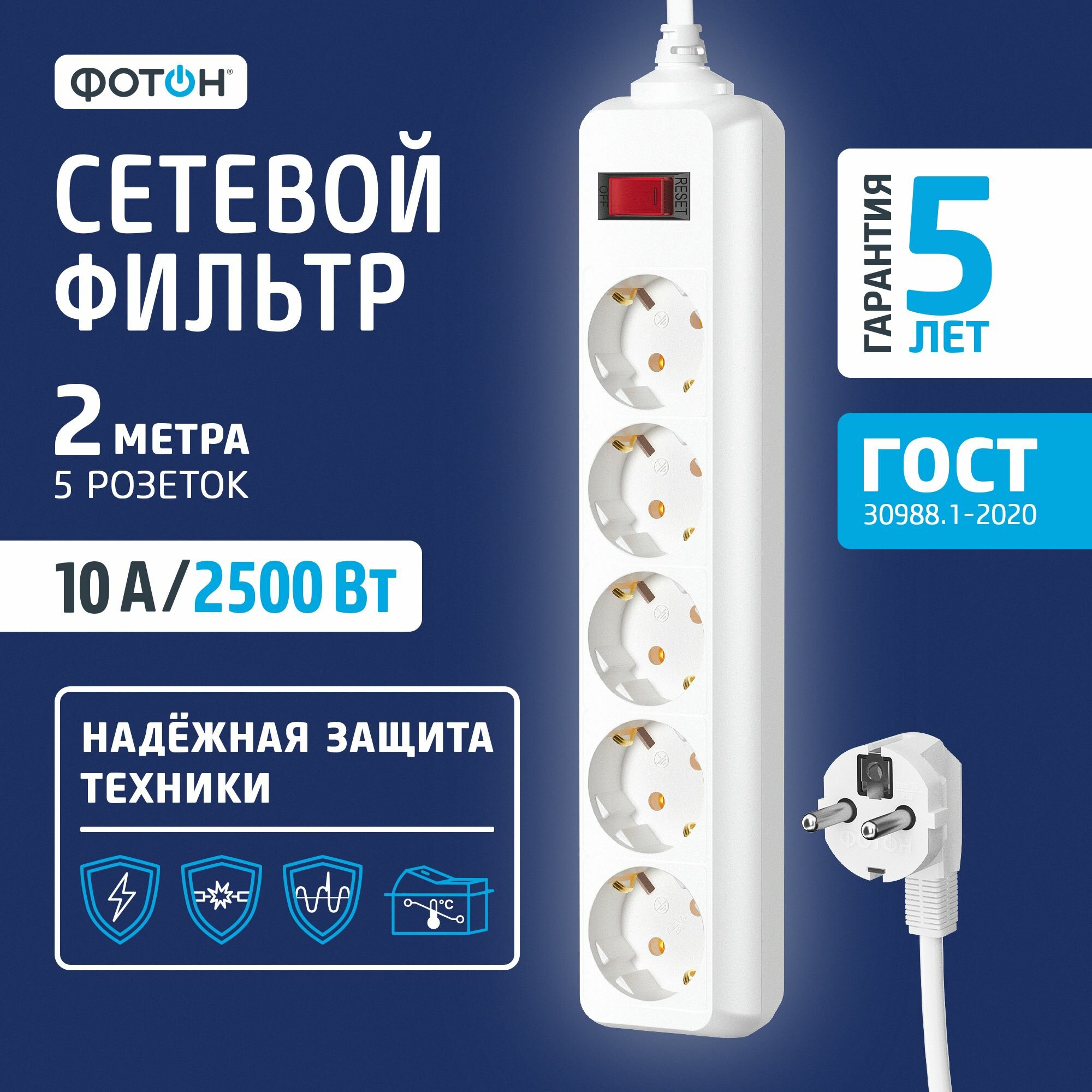 Комплект 2 штук, Удлинитель сетевой фотон 10-25S, 2м, 5 розеток, 10А, с выкл., Белый 2 238 ₽ Подробнее