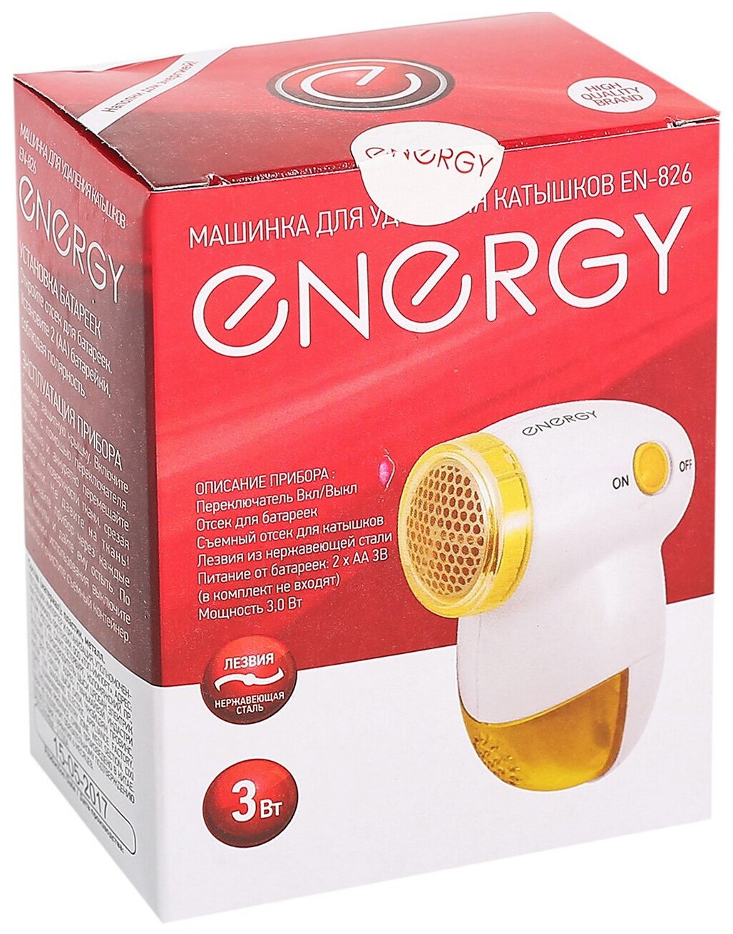 Лучшие цены. Машинка для удаления катышков ENERGY EN-826, 3 Вт, 2хАА (не в комплекте), бело-желтая Машинка для удаления катышков ENERGY EN-826 — ваша возможность сэкономить время и деньги на химчистке. Прибор прост в применении. Он легко поместится в женскую сумочку, поэтому его можно носить с собой. Рабочий механизм оснащён тремя лезвиями из нержавеющей стали. В комплект входит щёточка для очистки устройства и съёмный контейнер для катышков. Магазины в вашем городе.