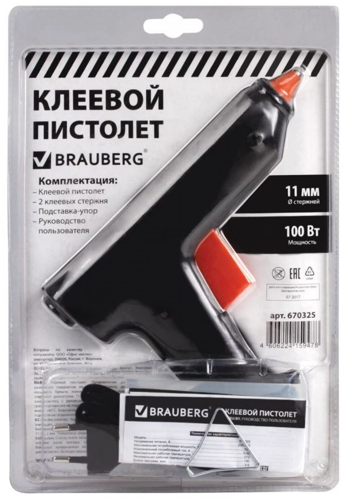 Клеевой пистолет, 100 Вт, для стержня 11 мм, BRAUBERG, в блистере, 670325 (арт. 670325)