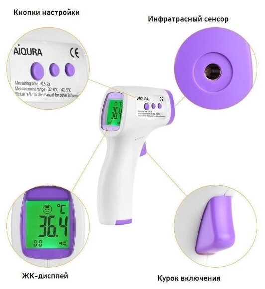 Лучшие цены. Бесконтактный инфракрасный термометр Aiqura AD801 - термометр для точного измерения температуры тела. Измерение производится одним нажатием на кнопку, расположенную на корпусе прибора. Нет необходимости прикасаться к коже человека - достаточно поднести термометр на расстоянии 3 - 5 см от лба, нажать на кнопку и с помощью инфракрасного датчика измерить температуру. Важно: чтобы показания термометра были точными, поверхность тела должна быть чистой и сухой. Магазины в вашем городе.