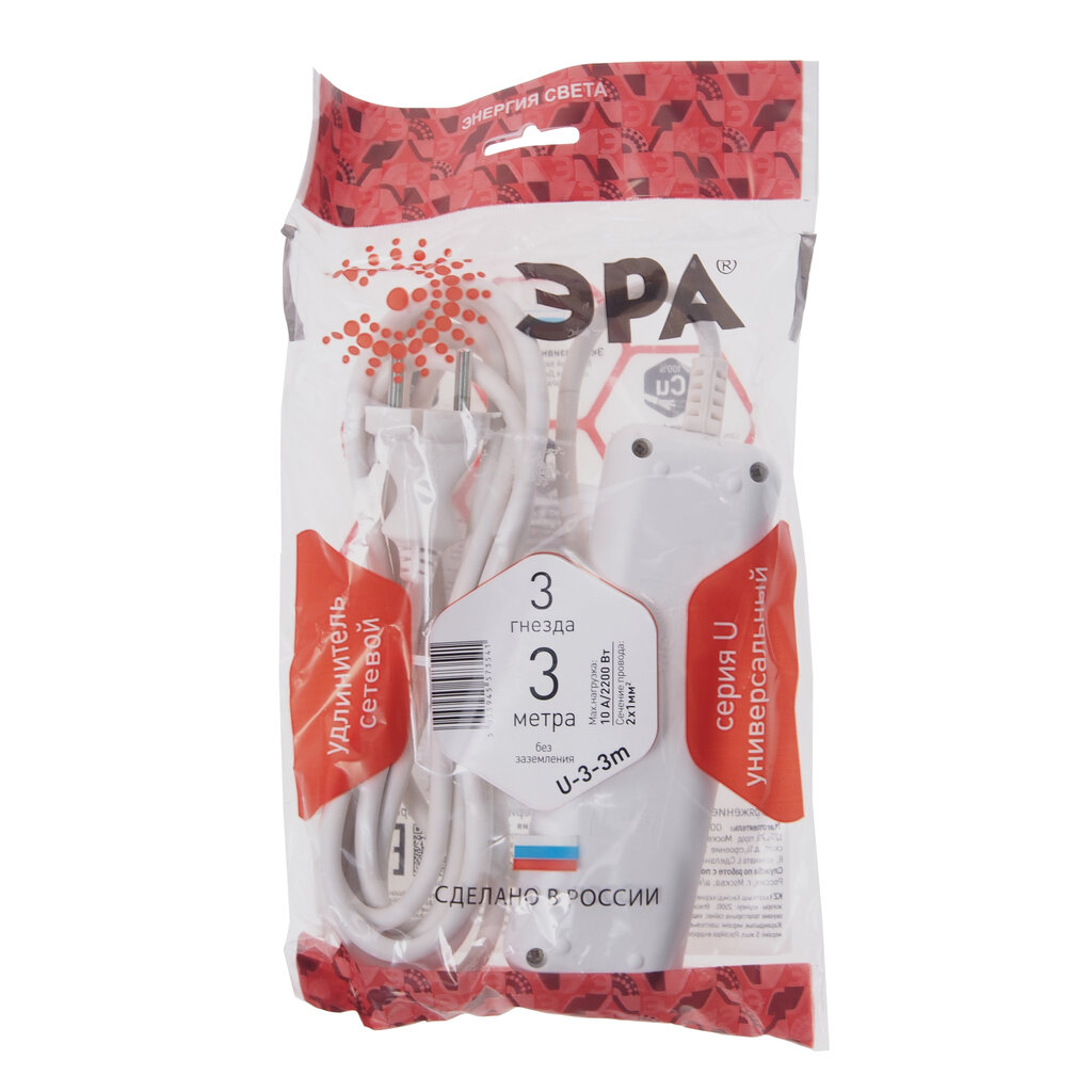 ЭРА сетевой удлинитель ПВС 2х1 3 розетка 3 м 10А/2200Вт (корпус негорючий PP) U-3-3m (РФ) 3541