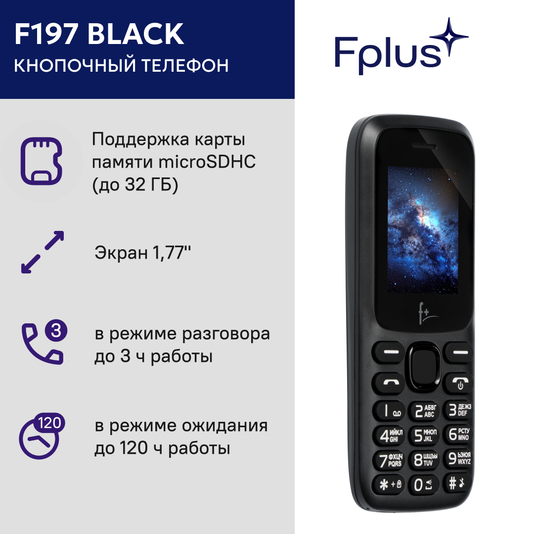 Лучшие цены. F197 Black — удобный телефон для ценителей лаконичного дизайна и надежности. Удобство и простота Современный кнопочный мобильный телефон F+ F197 Black выполнен в классическом стиле и отличается удобной клавиатурой с крупными клавишами. Это надежный двухсимочный телефон с хорошей батареей емкостью 600 мАч, которая обеспечивает неделю работы без подзарядки. Полезные функции Аппарат компактен, но имеет большой для своего класса дисплей с разрешением 128x160 пикселей. Магазины в вашем городе.