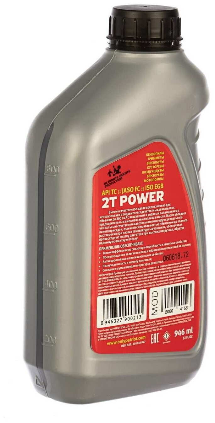 Лучшие цены. Минеральное масло Patriot применяется в 2-х тактных двигателях объемом не более 200 см3 (триммеры, бензокосы, культиваторы, бензопилы и др.) с воздушным охлаждением, с предварительным смешиванием и системой впрыска. Масло содержит уникальный многофункциональный набор присадок, отлично растворяется в бензине при низких температурах и обеспечивает первоклассную защиту деталей двигателя от трения при высоких нагрузках. Объем 0.592 л. Магазины в вашем городе.