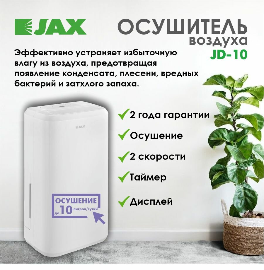 Лучшие цены. Осушитель воздуха JAX JD-10 предназначен для осушения воздуха в административных зданиях, подвальных и жилых помещениях, а так-же на коммерческих объектах, торговых залах, складских помещениях и даже на производстве. Осушители JAX JD-10 оснащен удобной интуитивно понятной панелью управления, режимом самодиагностики, регулировкой интенсивности осушения и фильтром дополнительной очистки воздуха, микропроцессорным управлением, возможностью запрограммировать время работы, выбор скорости вентилятора. Магазины в вашем городе.